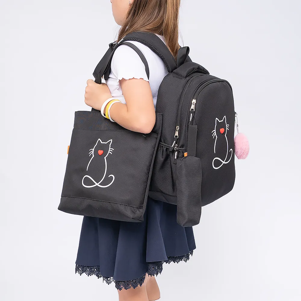 Рюкзак, сумка, пенал от торговой марки Ecotope из текстильного материала черного цвета с рисунком. Рюкзак с лямкой, плотной ручкой для переноски и регулируемыми плечевыми ремнями, дополнительно фиксирующимися на груди ремнями с застежкой фастекс. Два отделения на молнии. Сбоку - накладной карман без застежки. С лицевой стороны - карман на молнии. Декорирован подвеской. Сумка-шоппер с длинными ручками, отделением на молнии. На лицевой стороне карман на молнии. Пенал на молнии с петлей для крепления.