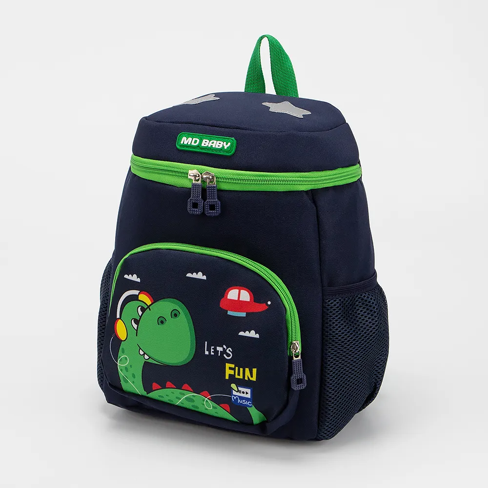 Детский рюкзак от торговой марки Ecotope из текстильного материала синего цвета с изображением динозавра. Модель с лямкой и регулируемыми плечевыми лямками, дополнительно фиксирующимися на груди ремнями с застежкой фастекс. Отделение на молнии. Внутри: текстильная подкладка, накладной карман. На лицевой стороне - накладной карман на молнии. По бокам - карман-сетка.